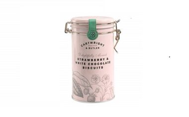 Lata de galletas de chocolate blanco y fresas